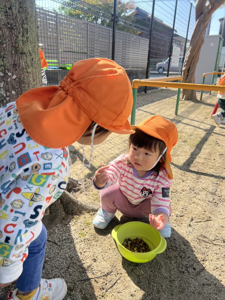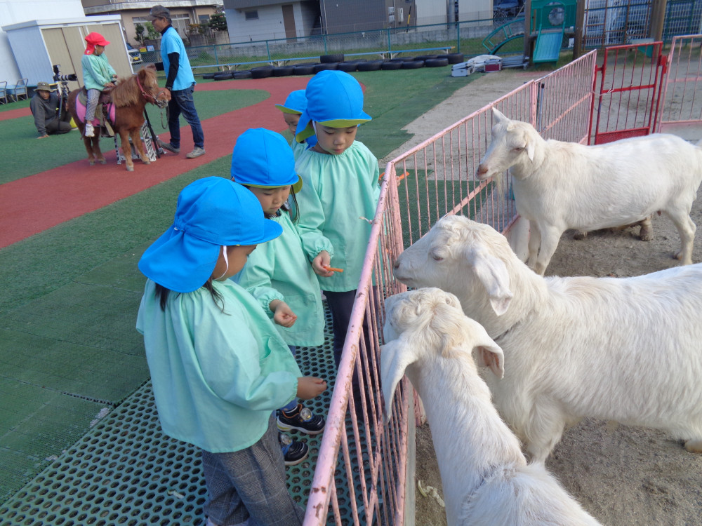 秋晴れの心地良い気候や冷たい空気に深まる秋や冬の訪れを感じますね。最近では、散歩に出かけて秋の自然物に触れながら遊ぶ子どもたちの姿が見られます。 きりん組は(4歳児クラス)先日、移動動物園が来て様々な動物と触れ合いました!優しく声を掛けながらえさやり体験も楽しんでいました☆ ひよこ1組は(1歳児クラス)秋の自然物に興味を示す子が多く、どんぐりや木の実などを見つけると、保育者や友だちと見せ合いっこする可愛らしい姿が見られますよ♡