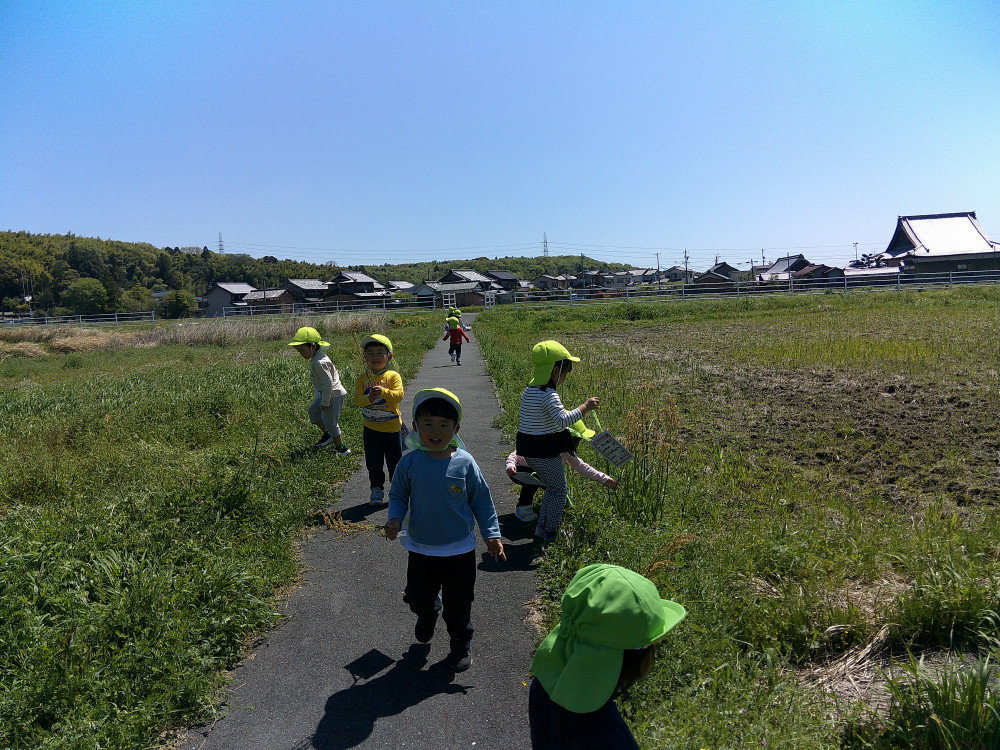 新しいお友だちを迎えて、新年度がスタートしました。少しずつ新しい環境に慣れ、安心して遊べる環境づくりをしていきたいと思います。又、園周辺の自然豊かな環境でたくさん遊びを楽しめるようにしていきたいと思います。 0歳児クラスでは、新しい環境の中でも少しずつ笑顔が 見られるようになってきました。 3歳児では、園周辺のあぜ道に遊びに行きました。 カードにのっている春の自然物や虫を探して遊びました。
