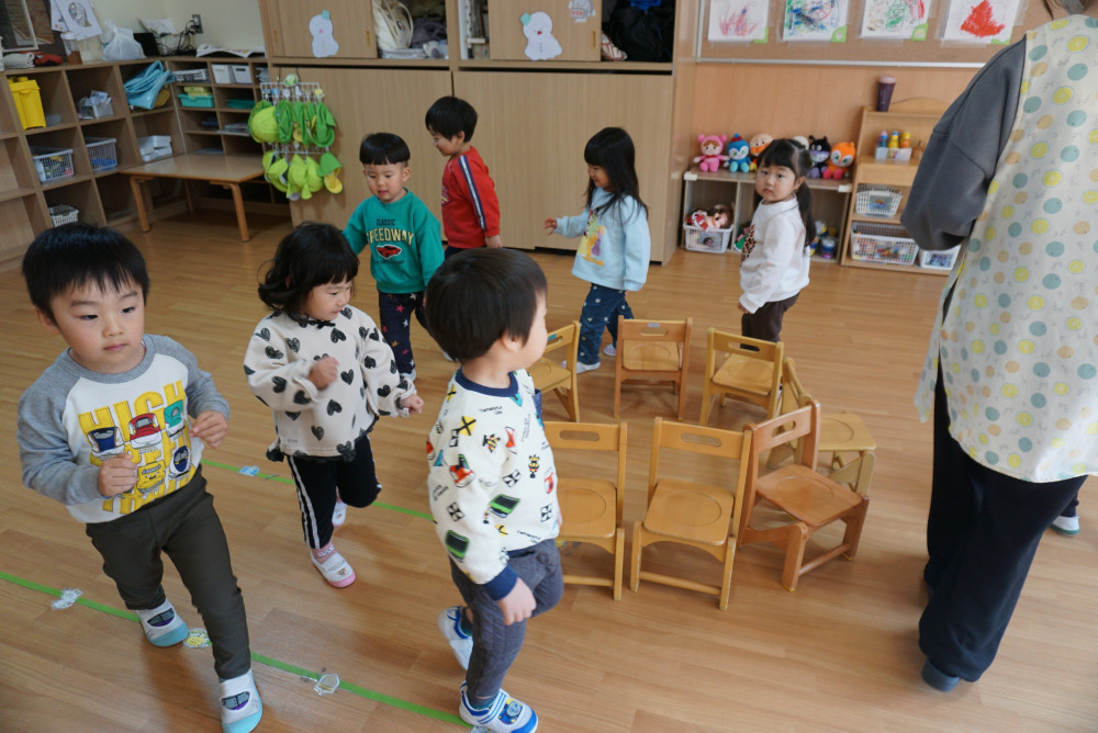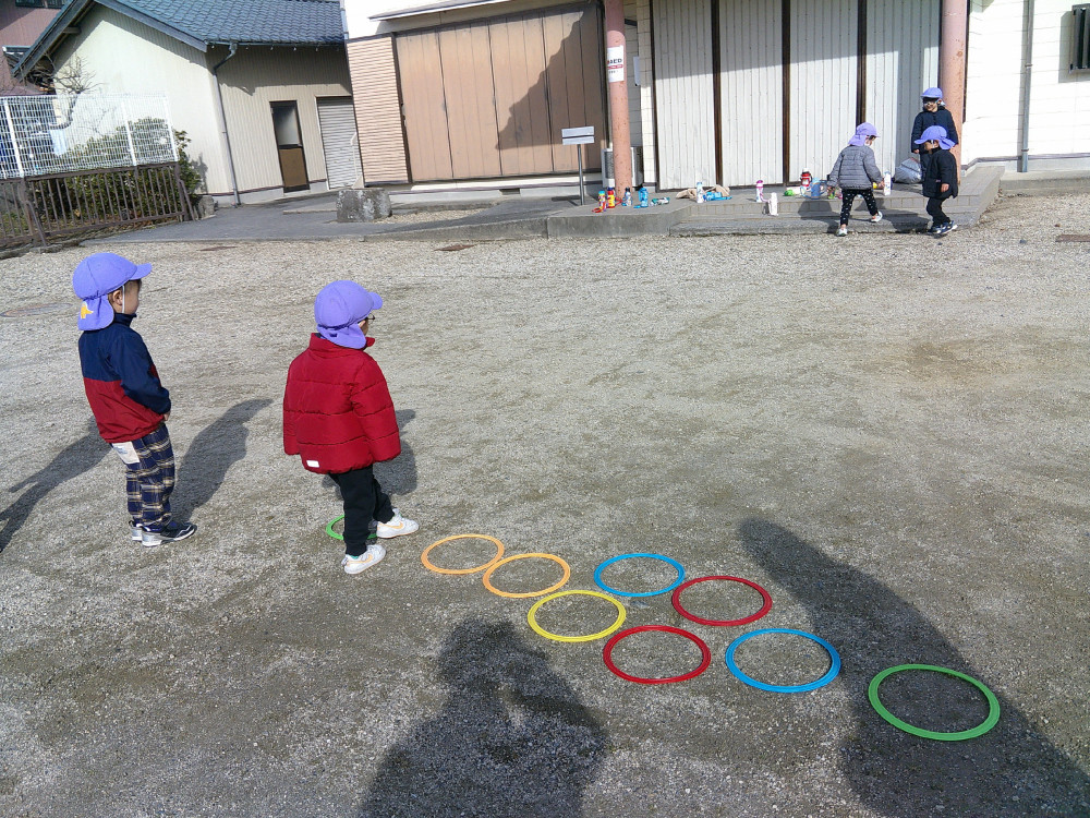 新しい年を迎え、園にはにぎやかな日々が戻ってきました。 冬の寒さも厳しくなりますが、天気の良い日は戸外でも たくさん体を動かして遊びを楽しんでいきたいと思います。 3歳児では、園周辺にある、西大鐘公民館に遊びに行ってきました。 公民館では、けんけんぱやだるまさんが転んだをして遊びました。 2歳児では、子どもたちの好きな音楽をかけて、 椅子取りゲームをして遊びました。 音楽がとまると空いている椅子を探して座り、 座れなかった子もお友だちを応援してくれていました。