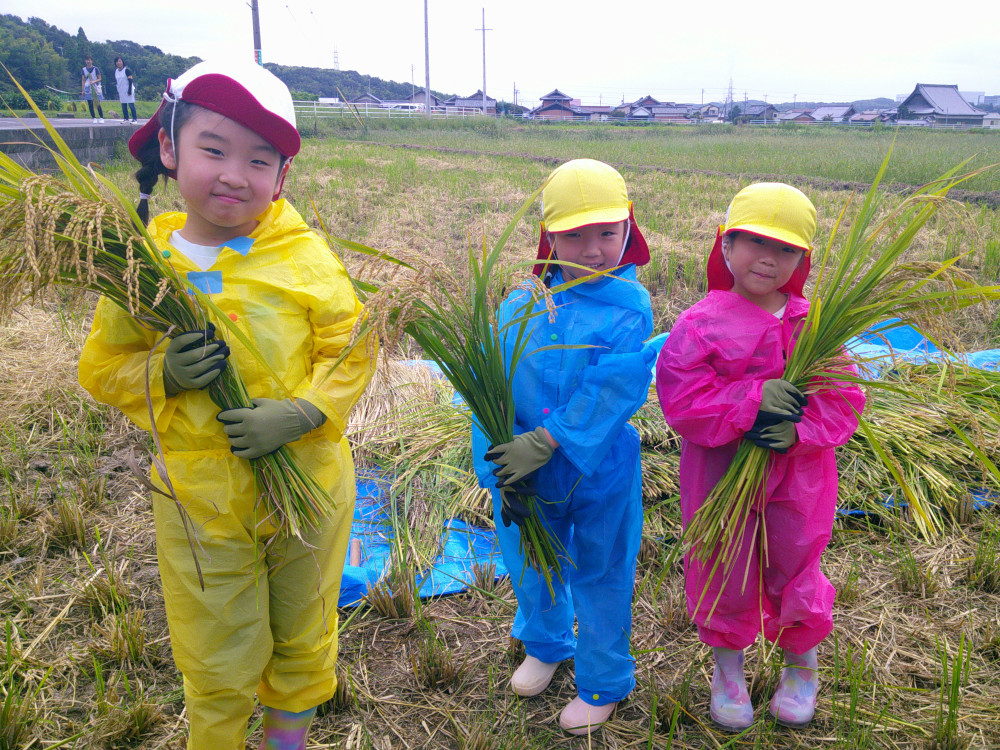 5歳児が5月に田植えした苗がすくすくと育ち、10月に稲刈りを行いました。稲刈りの仕方を教えてもらうと、初めは少しずつそっと刈っていた子も「こうやってするといいんだよ」と友だちに教えてくれる子がいました。できたお米は給食で提供となりみんな楽しみに待っています。