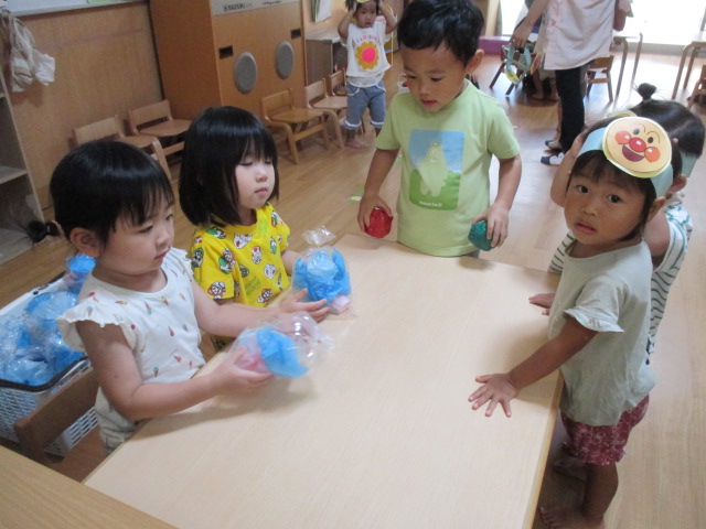 2歳児がお店屋さんごっこをし、0.1歳児も招待してくれみんなでお店屋さんごっこを楽しみました。0.1歳児は、お兄さんやお姉さんからもらったお土産を嬉しそうに持ち帰っていました。
